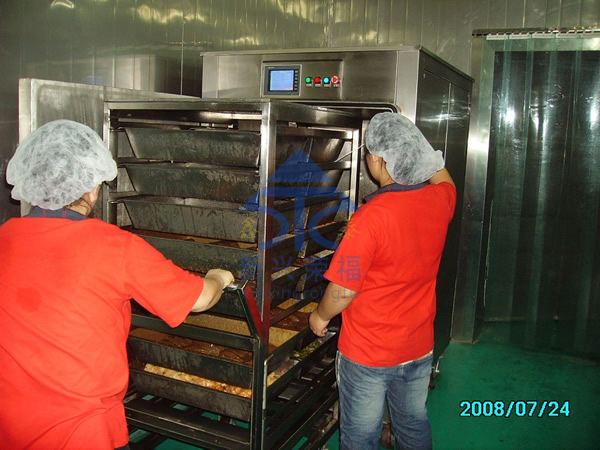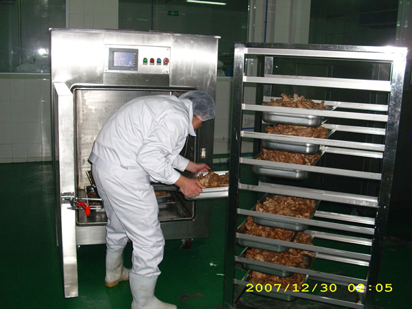2、用強(qiáng)冷風(fēng)冷卻(冷卻隧道),時(shí)間可縮短,但中心溫度仍下降緩慢,自然冷卻的缺陷仍然存在,冷卻不均勻?qū)е率称吠饫鋬?nèi)熱,大大降低了食品的風(fēng)味。使用強(qiáng)冷風(fēng)冷卻的另一個(gè)很大缺陷就是能源消耗很大。真空冷卻的迅速降溫,阻止了食品因本身加工完畢后自身余熱的作用造成的過(guò)度熟化,過(guò)度熟化會(huì)讓食品失去本身的特殊香味。(例如,炒制的綠葉菜,如不經(jīng)過(guò)20分鐘內(nèi)迅速的降溫,那么它將會(huì)褐變,顏色不再鮮艷)